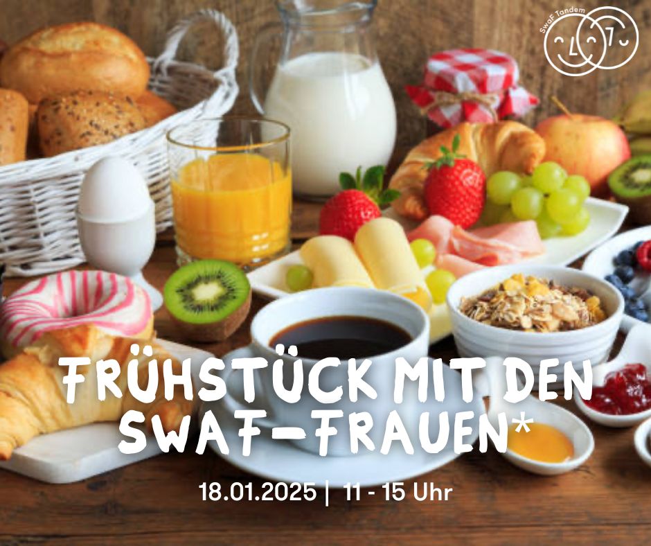 Bringt gerne etwas zu essen mit. Für Kaffee und Tee ist gesorgt. Gemeinsam wollen wir beim Frühstücken auch überlegen, wie die Veranstaltungen für Frauen* bei SwaF im neuen Jahr aussehen können.