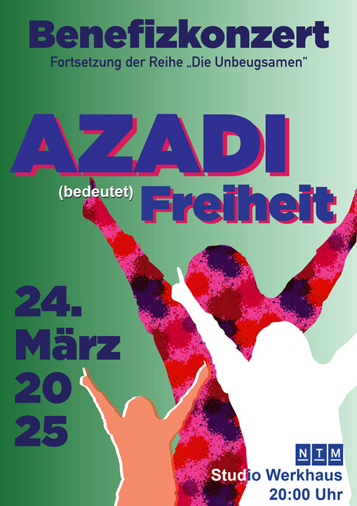Wir laden Sie herzlich zu einem besonderen Benefizkonzert ein, das ganz im Zeichen von Azadi, auf Farsi Freiheit steht. Seit mehr als 2 Jahren gehen die Menschen in Iran für diese Freiheit auf die Straße und widersetzen sich den Repressionen des Staates. Der Protest ist bis nach Deutschland vorgedrungen, nicht zuletzt, weil viele Iraner*innen hierher geflüchtet sind. Stellvertretend dafür haben wir die zum Christentum konvertierten Brüder Baradaran eingeladen, die uns ihre Geschichte erzählen und den Abend mit Ensemblemitgliedern des NTM musikalisch gestalten werden.