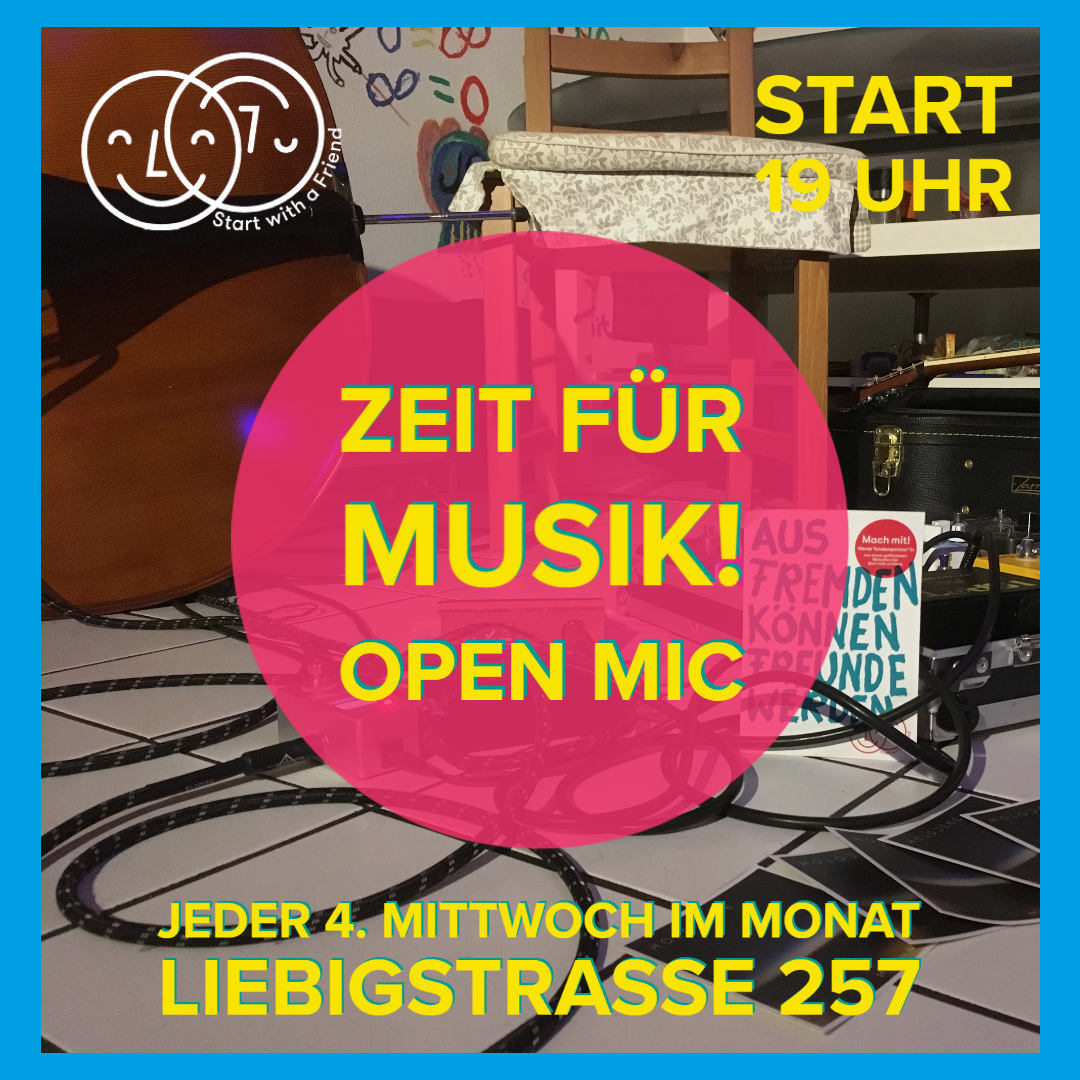 Das Liebig257 ist am letzten Mittwoch im Monat jetzt immer auch Musikzimmer. Wir wollen euch einladen Konzerte zu spielen. Ihr seid in einer Band und habt Lust aufzutreten? Oder ihr wollt bei einer Open Stage singen und mitmachen? Dann seid ihr hier genau richtig! Wenn ihr in unserem öffentlichen Wohnzimmer auftreten wollt, schickt eine Nachricht und eine Aufnahme an: otis.benning@start-with-a-friend.de – Wir stellen Technik, den Raum und übernehmen auch einen Teil der lokalen Werbung. Wir freuen uns auf eure Anfragen!