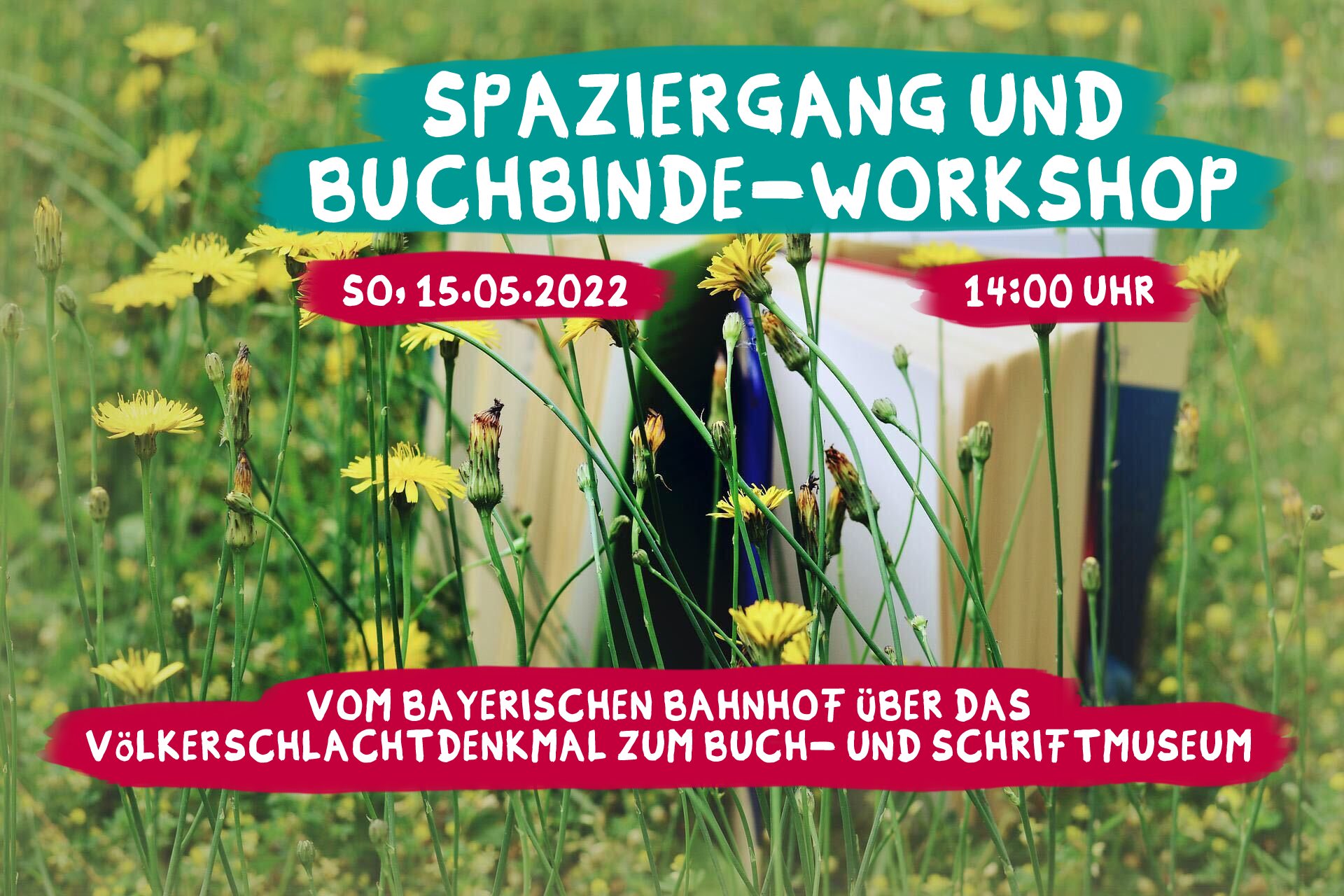 Wir laden euch zu einem Spaziergang zum Völkerschlachtdenkmal mit anschließendem Workshop zum Thema 'Buch binden' ein. Gemeinsam wollen wir vom Bayerischen Bahnhof zum Völkerschlachtdenkmal spazieren und einen Teil von Leipzig entdecken. Nach einer kleinen Pausen auf der kleinen Wiese vor dem Denkmal, machen wir uns dann weiter zu unserer zweiten Station: