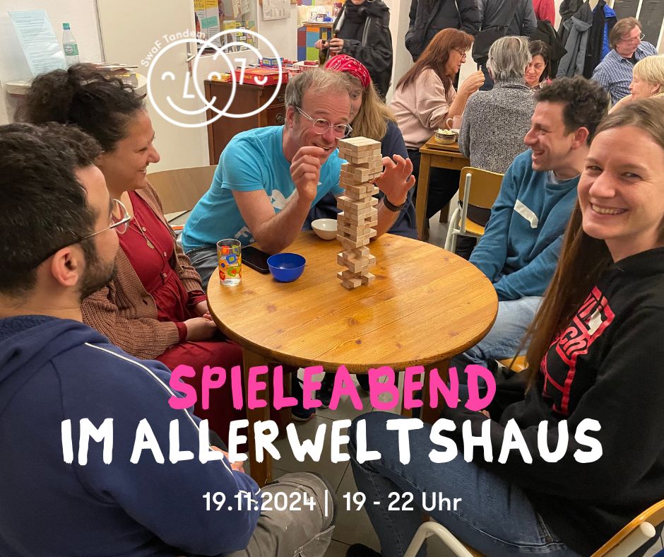 "Du spielst gerne Brett- und Kartenspiele? Und du lernst gerne neue Leute kennen? Dann könnte der Spieleabend im Allerweltshaus das Richtige für dich sein! Besonders Menschen aus anderen Ländern, die Deutsch lernen möchten und neue Kontakte suchen, sind herzlich willkommen. Wir sind eine offene Runde und jeder Mensch unabhängig seiner Herkunft, Geschlecht, sexuellen Orientierung, Behinderung gehört für uns als Mitspieler*in dazu."