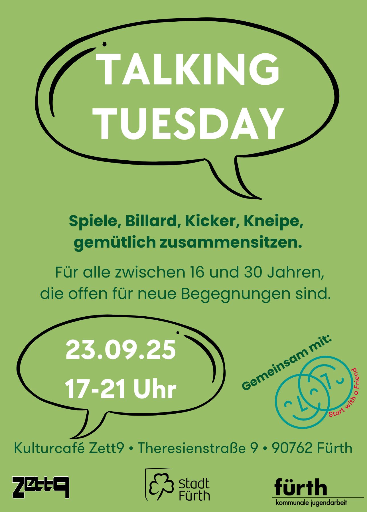 In Kooperation mit dem Kulturcafé Zett9 präsentieren wir den Talking Tuesday! 🎉