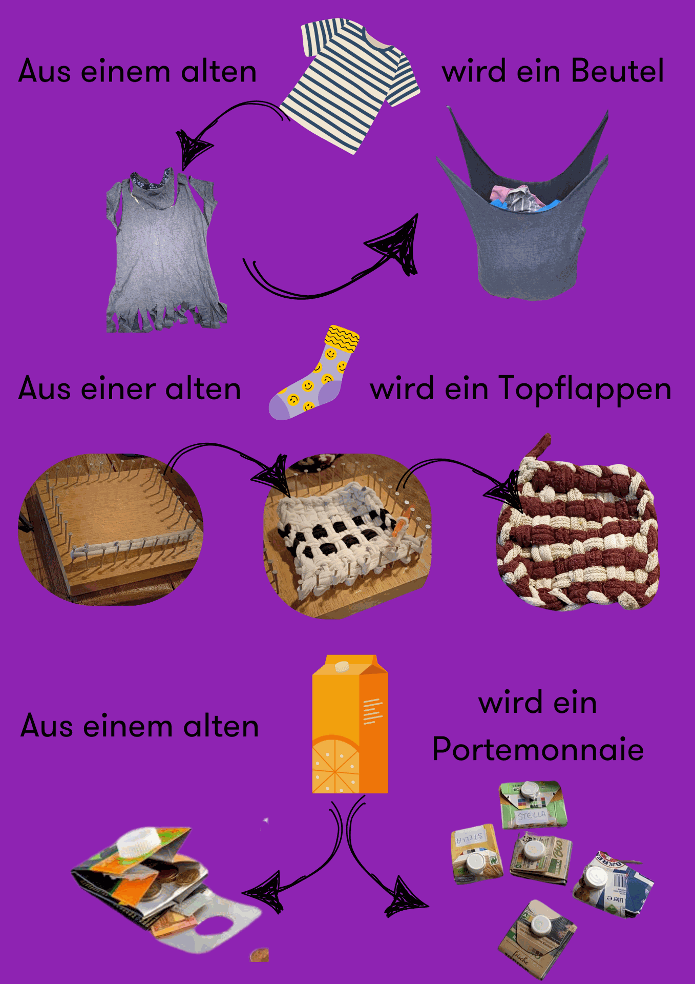 Wir wollen zusammen upcyclen. Das heißt wir nehmen alte Dinge, die wir nicht mehr brauchen und machen etwas Neues daraus! Wir verwandeln alte Tetrapacks in kleine Portemonnaies, Tshirts in Beutel und Socken in Topflappen.
